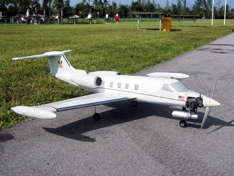 Learjet 40. Radio control sport-scale model. Wingspan 55.5 in. For .40-.50 engine. Tractor prop layout.
